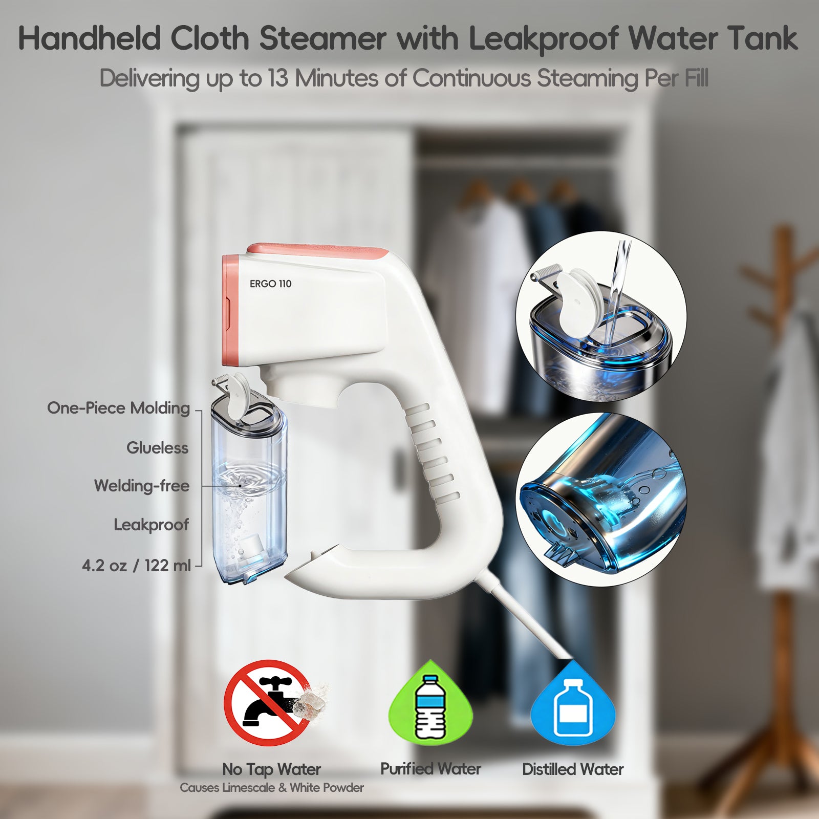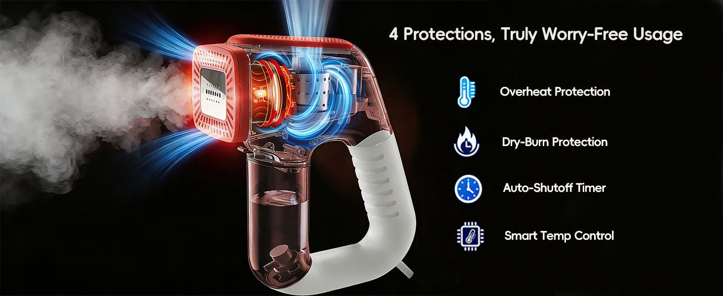 - 【Safe and Convenient, Edge-Protective Heat-Resistant Plastic,Over-Temperature Control Protection | 110° Ergonomic Comfortable Handle】 The clothing steamer handheld is very easy to operate. With 110°ergonomic design, you can hold it for a long time without getting tired. preventing dry burning and a heat-resistant plastic suction inlets to prevent hands burns. Using it is safe and worry-free. Travel clothes steamer is a thoughtful high-quality gift for family members, partners, or for personal use