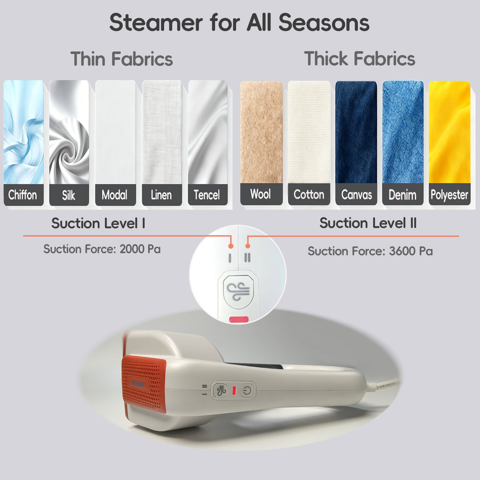 - 【Two Adjustable Suction Levels, Compatible with Most Fabrics–From Delicate Silk to Thick Denim and Coats, Handles All Your Family's Clothing Care Needs, Plus Curtains, Sofas, Bed Sheets, and Toys】 Our handheld steamer for clothes features adjustable suction Two levels: 2000Pa for gentle care of delicate fabrics like silk and chiffon, and 3600Pa for tackling tougher materials like denim, coats, and even curtains. This vacuum garment steamer meets the ironing and steaming needs of all your family’s clothing, saving you time and effort.