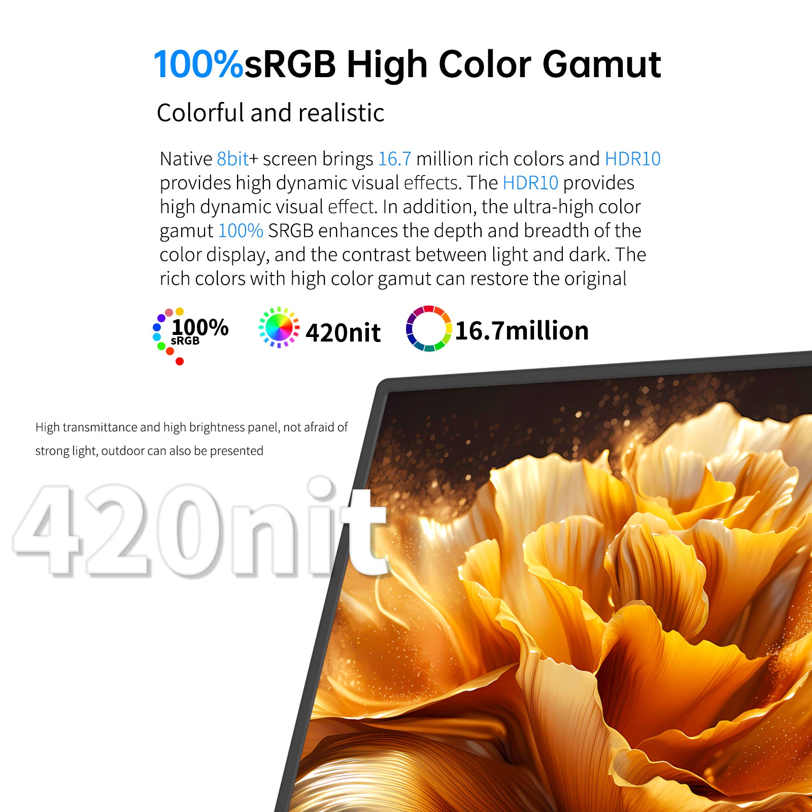 The 3DOEX 10.5-inch portable monitor offers a stunning 1920x1280 FHD IPS display with HDR10 support, delivering vivid clarity and 100% sRGB color accuracy. With 420 nits brightness and a 1500:1 contrast ratio, this ultra-slim screen is ideal for detailed tasks like photo editing, video work, and immersive gaming. It features easily switchable aspect ratios including 3:2, 16:9, 16:10, and 4:3, adapting perfectly to documents, coding, movies, or retro gaming. Equipped with dual USB-C (PD 3.1 Gen2) for multi-device compatibility and seamless switching, along with built-in stereo speakers and a wide 178-degree viewing angle, it's a versatile companion for your laptop, PC, or phone.